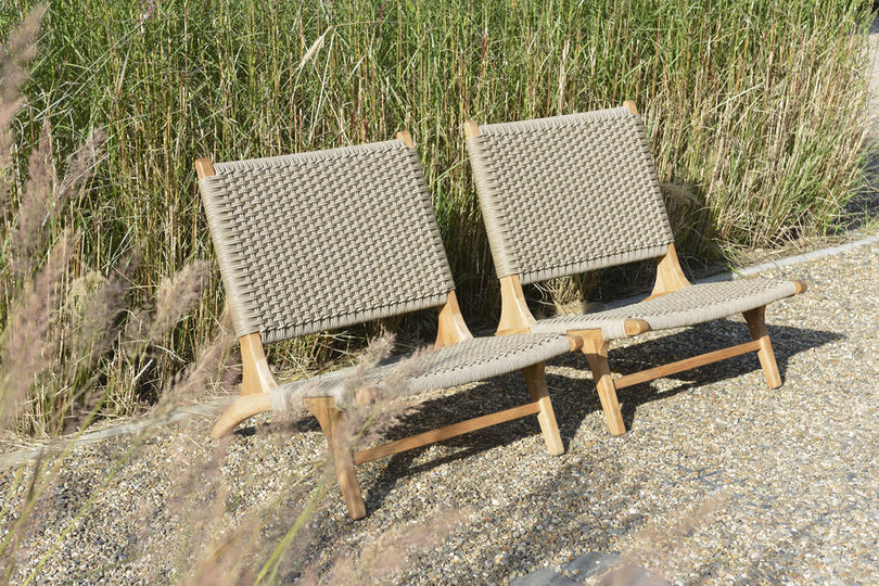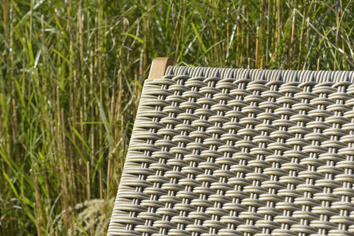 Het frame is gemaakt van teakhout, de zitting van gevlochten weerbestendig Ardenza Rope in de kleur zand.