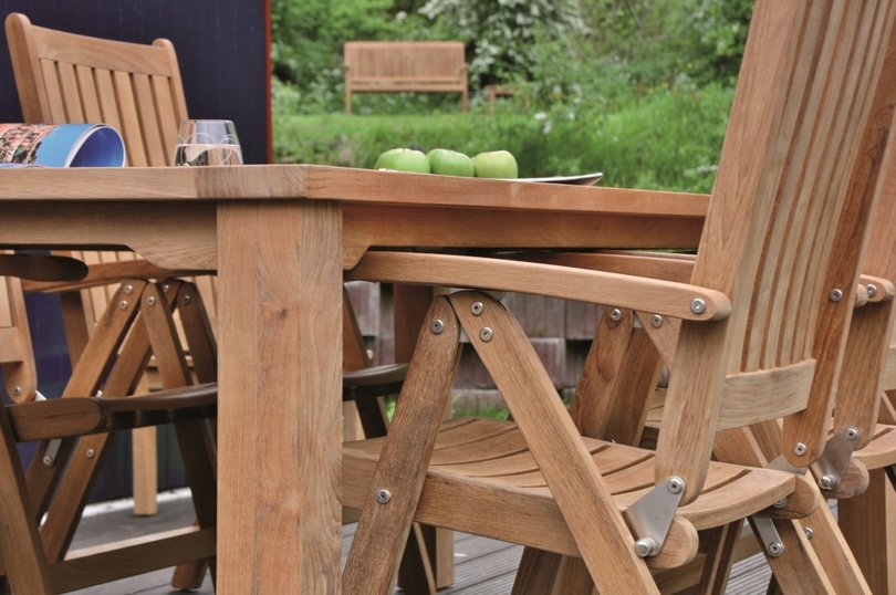 De stoel is gemaakt van teakhout met rvs beslag. De stoel is eenvoudig te verstellen en is inklapbaar.