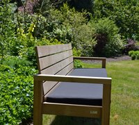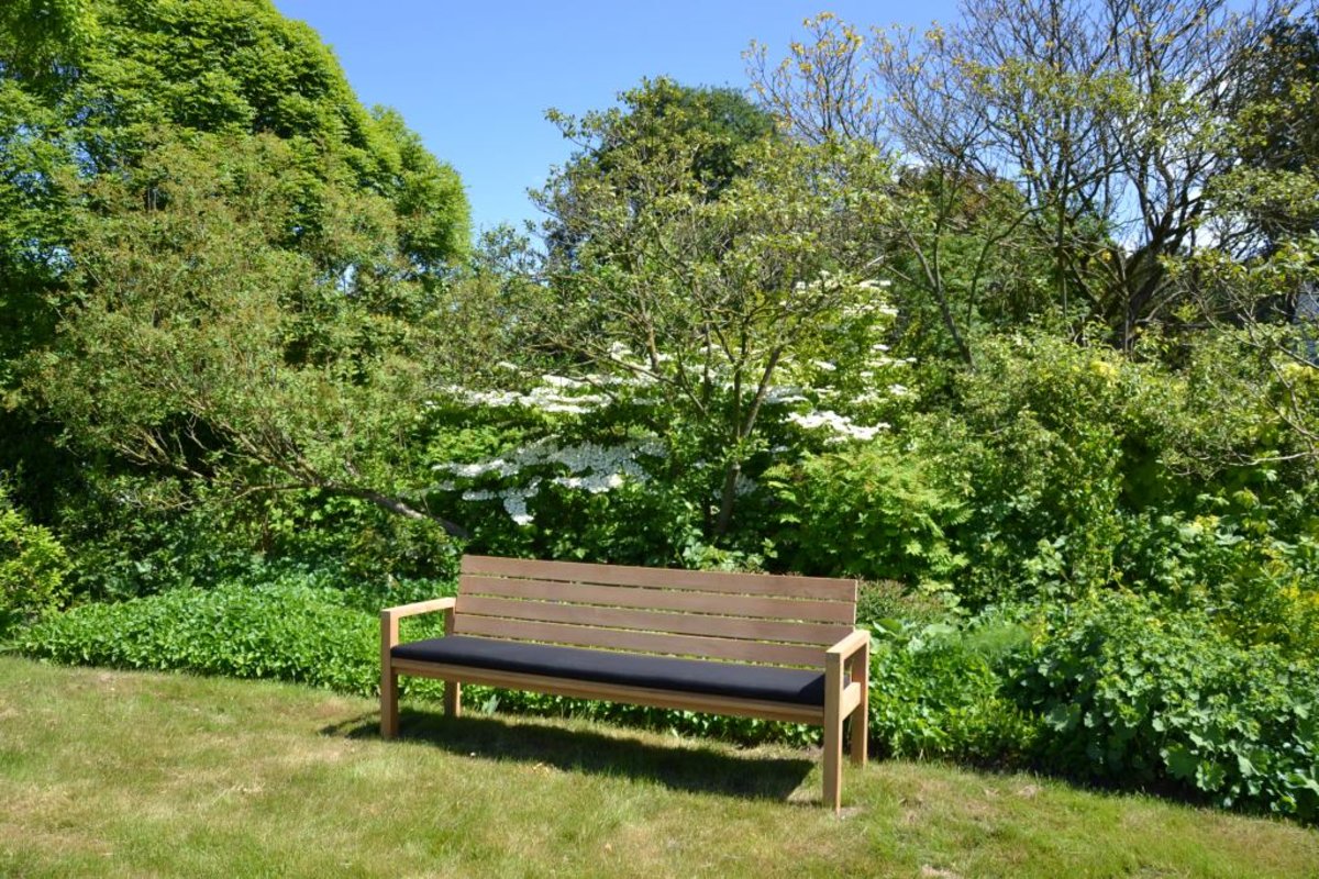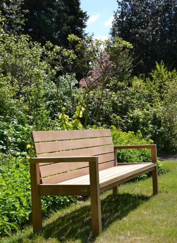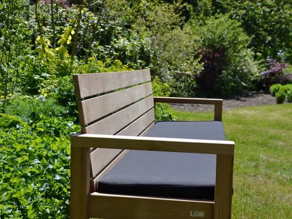 De bank is gemaakt van teakhout met rvs beslag. de bank is ook verkrijgbaar zonder armleuningen.