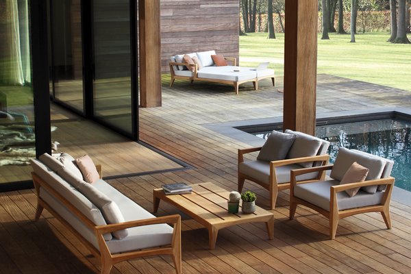 De gehele lounge is gemaakt van een teakhouten frame met daarop acryl kussens in vele kleuren en kwaliteiten leverbaar.