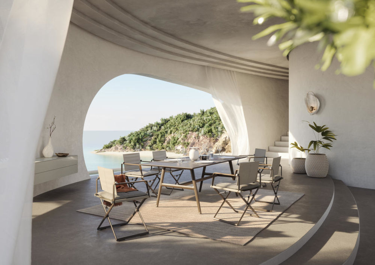 De opvouwbare stoel is gemaakt van aluminium en weerbestendige bekleding.