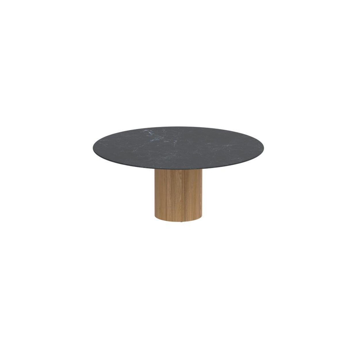 De Regaliz Table, ontworpen door Kris Van Puyvelde, staat bekend om haar krachtige ronde teakhouten bases met een sculpturaal glazen blad. Dat glas is verkrijgbaar in drie verfijnde afwerkingen: donkergroen, donkerbruin en pebble. Dankzij een gespecialiseerd smeltproces krijgt het oppervlak een uitgesproken textuur en diepte. en blad. Op de ronde poot kunnen ronde tafelbladen van 120 tot 160 cm geplaatst worden, of je kiest voor twee ronde poten voor grotere bladen. De ronde Regaliz poot is ook beschikbaar als low lounge variant.