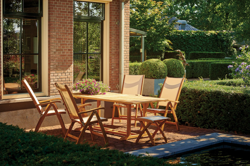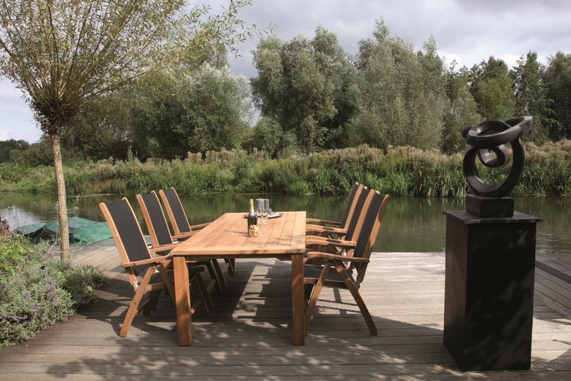 De zitting is gemaakt van Textileen® en verkrijgbaar in drie kleuren. Het frame is van teakhout met rvs beslag.