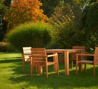De stoel is gemaakt van teakhout en is stapelbaar.