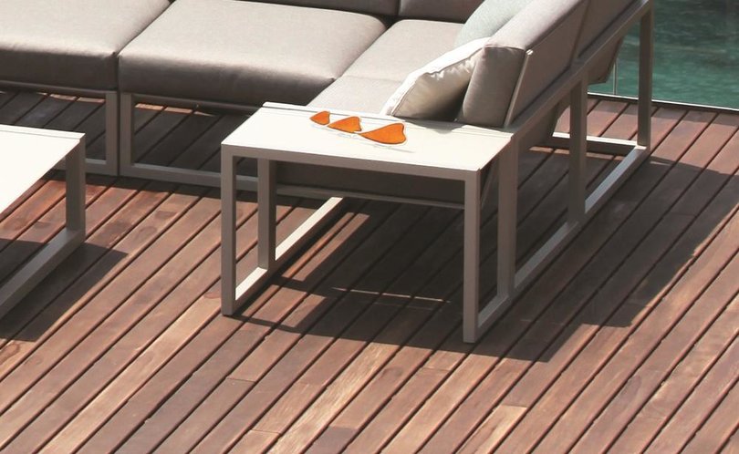 Het tafelblad is van teakhout of van keramiek, het frame is van geborsteld of geelectropolijst roestvast staal of gepoedercoat rvs.