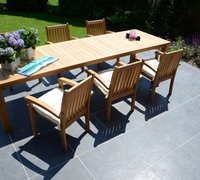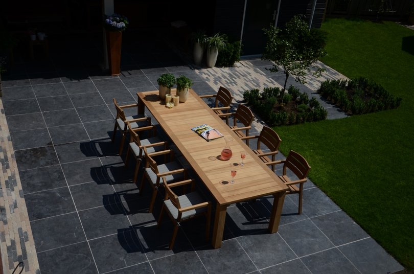 De tafel is gemaakt van teakhout en verkrijgbaar in twee lengten: 240 cm en 320 cm.