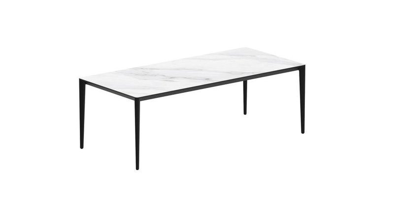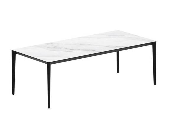 Het blad kan uitgevoerd worden in teak of keramiek. Het keramiek is leverbaar in de kleuren taupe grijs, wit marmer, cement, vulkaan zwart, wit, zwart, parel grijs of travertine.