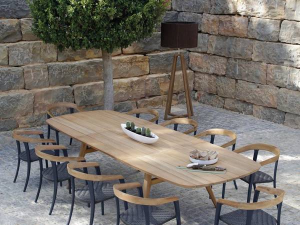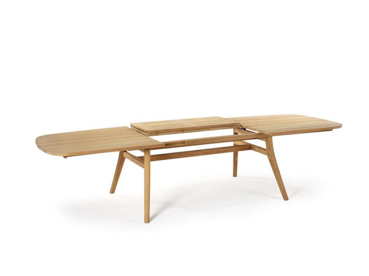 Het frame is uitgevoerd in teakhout. Het tafelblad is van teakhout.