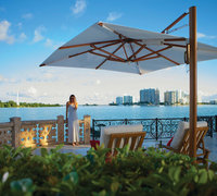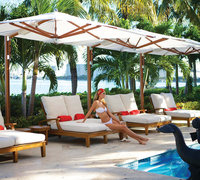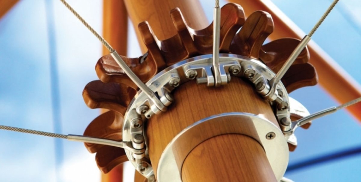 Aluminium mast en baleinen in een teak-finish, doek Sunbrella Marine.