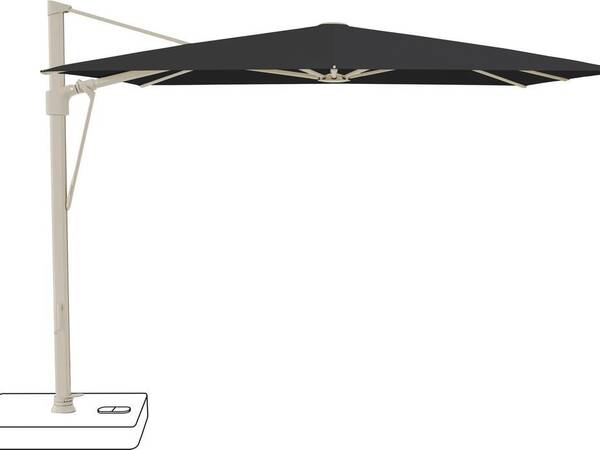 Deze design parasol heeft een mooi vormgegeven mast met afgeronde baleinen, gemaakt van gepoedercoat aluminium in de kleuren antraciet of grijs. Het doek is kantelbaar drie standen naar rechts en drie standen naar links.